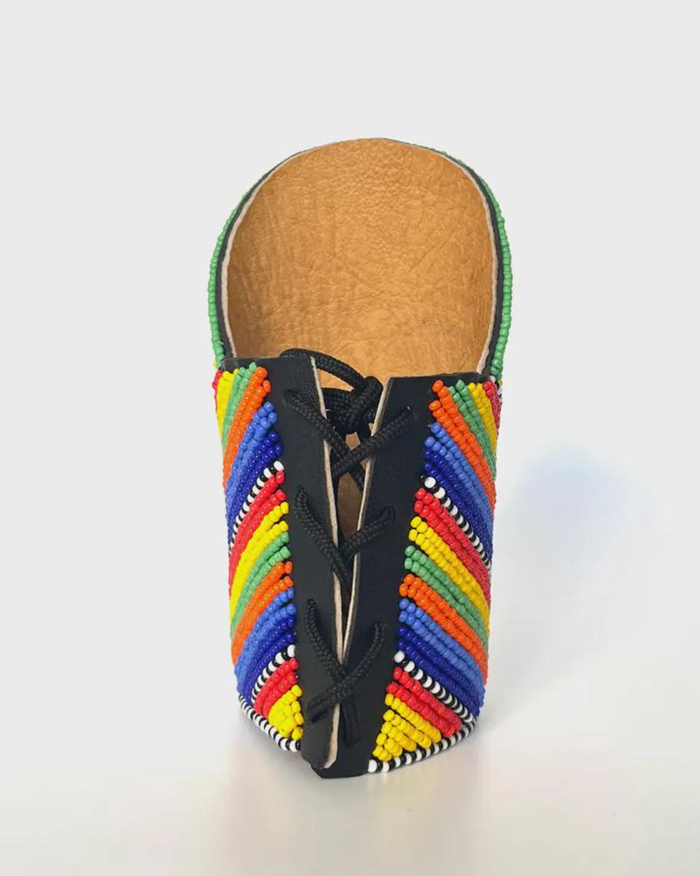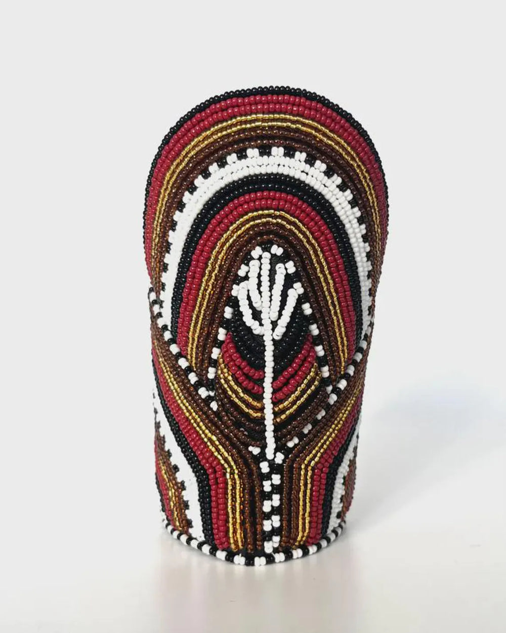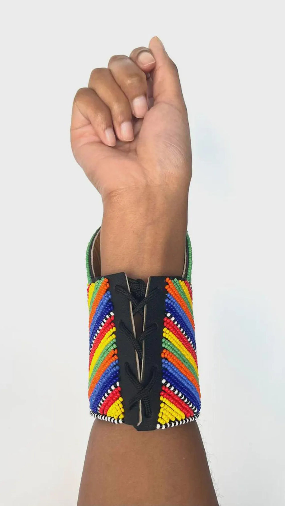 This elaborate Maasai beaded leather cuff embodies the grandeur of traditional adornment, often worn everyday. Featuring dense, multi-layered beadwork, intricate patterns, and a symphony of vibrant colors, it's a masterpiece of handmade beadwork.