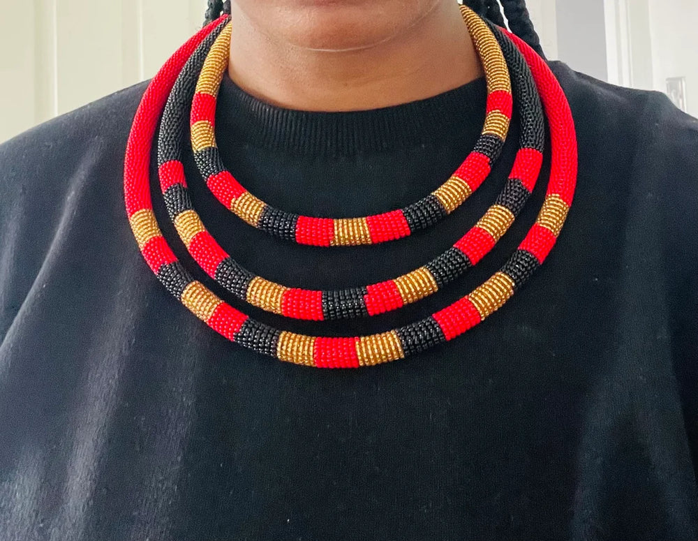 Vibrant Maasai Beaded Collar Necklace - Kenyan Craft. Eye-catching ceremonial piece. Dense, multi-strand glass beadwork in iconic Maasai patterns. Ethically made. Bold African jewelry statement.